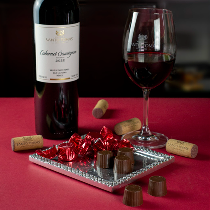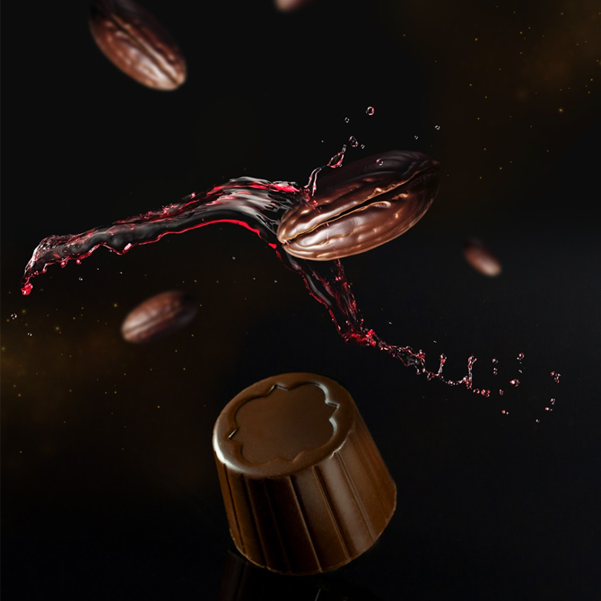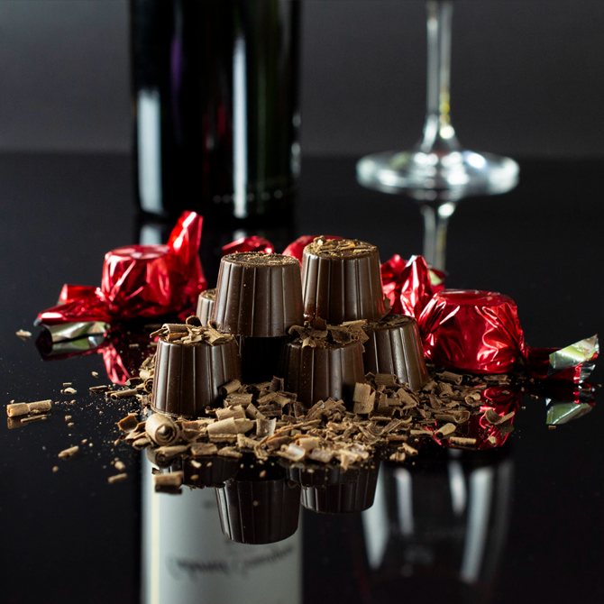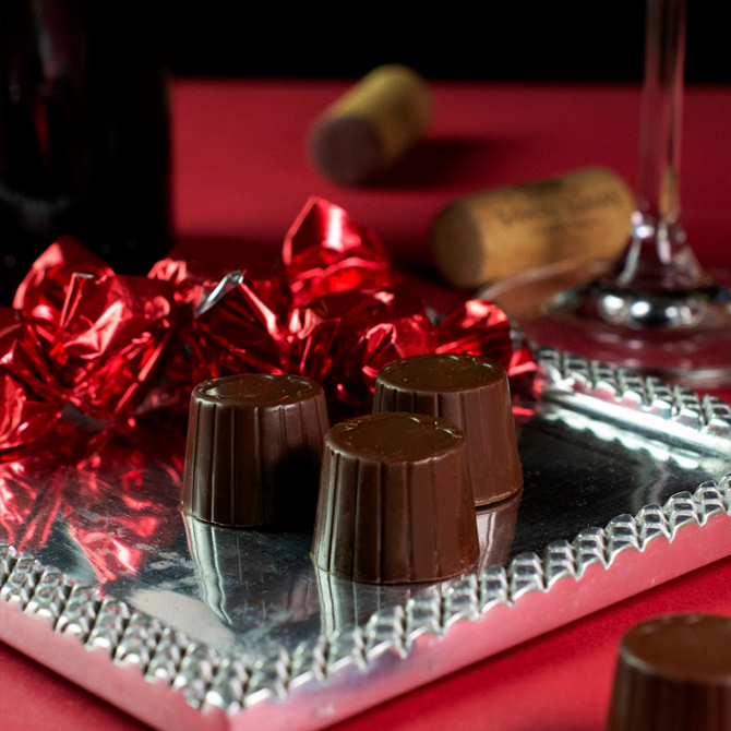Cajilla de Chocolates con Vino Tinto de 100 g Chocolate Amargo relleno con vino tinto Cabernet Sauvignon Una mezcla de cacao del 66 % en su integración de la formula Relleno con vino tinto 30% Contiene 1.9% de alcohol