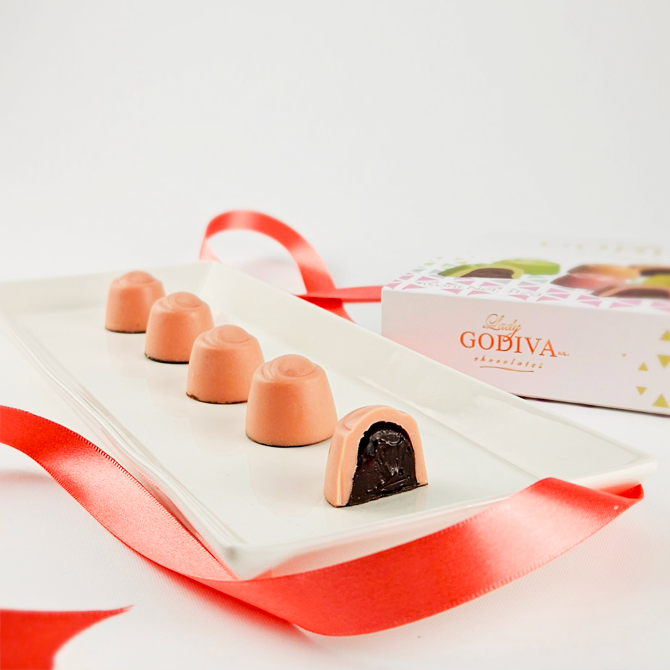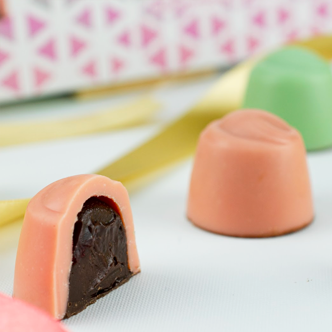 - Chocolate amargo con cubierta de chocolate blanco sabor cereza y relleno sabor cereza con chocolate amargo.