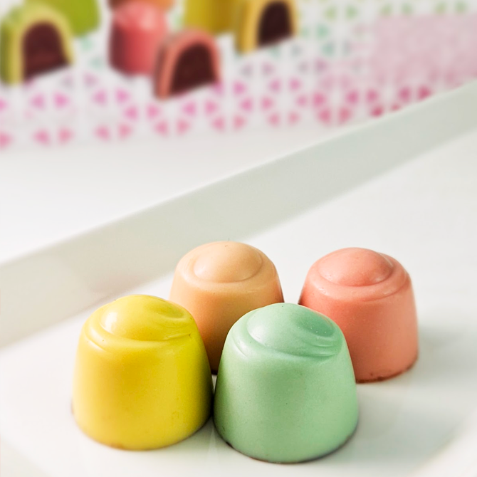 - Chocolate amargo con cubierta de chocolate blanco sabor rompope y relleno sabor rompope con chocolate amargo.