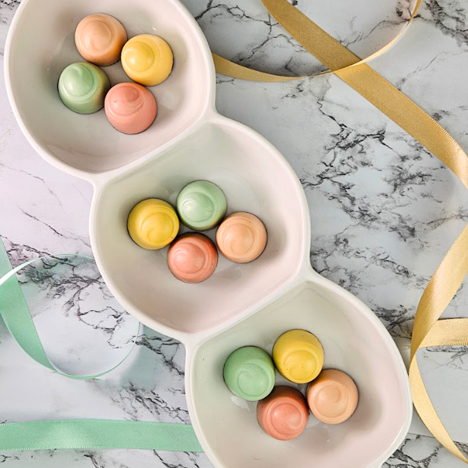 - Chocolate amargo con cubierta de chocolate blanco sabor menta y relleno sabor menta con chocolate amargo.